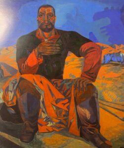Алдаспан ақын Махамбеттің бейнесінде қара бояу мен ал қызыл бояу басым. Неге? Махамбеттей жалынды, азулы ақынның портретін беруде суретші осынау түстерге кездейсоқ басымдық беріп отырған жоқ. Маң далада, арқасын жон-жон Нарын құмдарына тіреп отырған айбатты, айбарлы ақынның бойынан бірден қайрат пен қайсарлық қатар көрінеді.