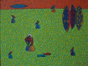 Композицияда ашық жасыл және қызыл түсті киім киген, басын иығына түсіріп, өзінің ішіне үңіліп, ойға шомған адам бейнесі суреттелген. Оның айналасындағы балықтар мен құстарды шахматты тәртіпте орналастырған. Мұндағы құс – жер мен аспанды жалғастырушы, еркіндіктің, адам жанының, ал балық – интуицияның, бейсаналықтың, өмірдің мәңгі қозғалысының, судың символы. Сарғыш-жасыл, көк, қызыл түстер картинаға кереғарлық дарытып тұрғанымен, туындыға вибрациялы қозғалыс бергендей, өзара үйлесімділік тапқан. Бояулар арқылы кеңістікті екіге бөліп, жер мен аспан, рух пен материя сияқты әлемнің дуализіне баса назар аудартады. Болат Тұрғынбай туындыдағы түстердің негізінде құрылған ырғақты қозғалыспен адамның ішкі рухани мазмұнын да ашып көрсеткен. Жалпы, суретші адам мен табиғат және космос тыныштығының мәңгі қарым-қатынаста болатынын аңғартып, әлемді рухани жүйе ретінде өрнектеген.