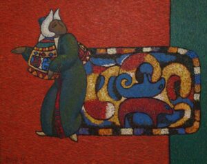 Кескіндемеші бейнелерді бірінің артына бірін орналастырып, қатпарлы жазық бетті композицияда орындаған. Әйелдің киіміндегі, қоржынындағы өрнектер мен артқы жағындағы стильденген жануар мотивіндегі бейнелер – бақуатты қазақы дәстүрлі мәдениеттің көрінісі. Сонымен қатар қызыл, жасыл, көк, сары түстер сәнді ұлттық стильді одан әрі айқындай түседі. Ерекше көзге түсетіні, қазақтың киіз өрнегіне ұқсас әрбір кескіннің сыртынан жүргізілген қара түсті сызық бейнелерді айқындай түседі. Қазақ халқының дәстүрінде киіз басқанда алдымен қара түсті жүннен иректеп өрнегін сызып алып, оның ортасын әр түске боялған жүнге толтырып барып басады. Содан өрнектер қара түспен жиектеліп, анық, дара-дара болып көрініп тұрады. Бұндай тәсіл өрнекке даралық, монументальдылық береді.