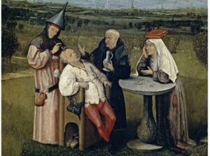 Әлі есімде, шамамен орта ғасырға тиесілі деген бір картинаның репродукциясы қабырғаға қайталанып салынған екен. Алдында орындық тұр. Сол орындыққа отырып, басыңды шалқайтып фотоға түскенде, картинаның бір бөлшегіне айналып, фотосуретті естелікке сақтап алуға болады. Қаптаған кезекте балаларын ертіп алған ата-аналар мәз-мейрам күйде фотоға түсіп әлек. Орындықта отырған адамның басын пышақ тәрізді құралмен шұқылап тұрған фондағы кейіпкердің бірі дәрігер болса керек, оның жанында қара жамылған монах, ал басында кітабы бар әйелдің діни қызметкердің киімін киіп тұрғаны анық. Төрт кейіпкерді бейнелеген ортағасырлық антураж. Көңіл көтеріп, қыдырып қайтамыз деген «Иллюзион» атты көшпенді мұражайдың дәл осы инсталляциясы алдындағы ағыл-тегіл адамдардың әрекетіне көз алмай ұзақ қарадым. Біраз бақылаған соң, әрі қарай басқасына алданып кете бардым. Бірақ сол сәттің жадымда қалғаны сонша, көп жыл өтсе де көз алдыма орала беретінін байқап жүрдім. Ол кезде картинаның атауын да, авторын да танып-білмеген шығармын. Бір күні кітап дүкеніне кіріп, кездейсоқ қолыма түскен үлкен энциклопедияны парақтағанымда, дәл сол картина көзіме оттай басылды. Тіпті сонда да санамның түбінен шыққан ой жаңғырығына аса мән бермедім. Картина авторы – Иероним Босх. Туындының атауы – «Ақымақтық тасын алып тастау отасы».