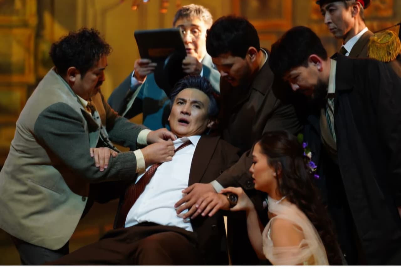 Әуеннің бірде шарықтап, бірде құлдилайтын сәті… «Мені елдік шаруалар күтіп тұр. Әлемдегі, жер-жердегі табиғат апаттары, су тасқыны, зілзала… Ол жақта адамдар аш-жалаңаш, азапта отырғанда менің мұнда той тойлап жүргенім жарамайды, дереу кетуім керек!» Кешегі әккі Хлестаковтан осылайша бәріміздің көз алдымызда бүгінгінің қу, жемқор қайраткерлері, айлакер коуч-блогерлері «балалай» береді. «Біз біргеміз!» жәшіктерін көтеріп ап ары-бері сапырылысқан массовка мен жиналған жылуды тиеп ап, «тескен таудан» ары асатын тікұшақ көз алдымызға Перизат Қайрат оқиғасын көлбеңдетеді. Синтезді тапқыр тәсілдер алданғанын сезіп, сан соққан сәттегі дуанбасының пұшайман хәлін аудиторияның жемқор ортадан шаршаған жеккөрінішімен әдемі астастырып жібереді. Қоғамның дамуын кешеуілдететін мұндай кесел, барлық дерт кез келген форматта шынайы өмірде болсын, өнер тілінде болсын әшкереленіп, айыпталуы тиіс. Ал «жаманнан жирендіру» — өнер тілінде өтімді.