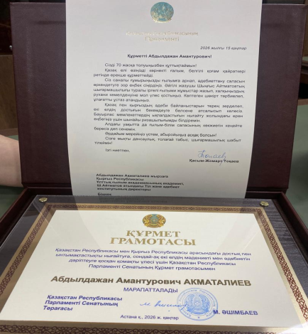 Сонымен қатар, Абдылдажан Амантұрұлы Қазақстан Республикасы Парламент Сенатының төрағасы Мәулен Әшімбаев қол қойған Құрмет Грамотасымен марапатталды.