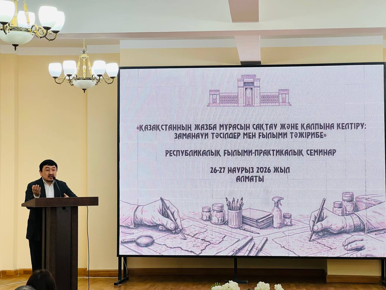 Семинар BR28712621 «Қазақстанның қолжазба мұрасы: реестрлеу, реставрациялау, ғылыми каталогтау, цифрландыру және кешенді кодикологиялық зерттеу» ғылыми бағдарламасы аясында Реставрация және консервация орталығының ұйымдастыруымен өткізілуде. Екі күнге созылатын жиынға еліміздің өңірлерінен 70-ке жуық маман — реставраторлар, кітапханашылар, архив және музей қызметкерлері, сондай-ақ жетекші ғылыми мекемелердің басшылары қатысуда.